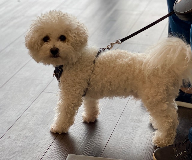 Sie wurde am 07. Dezember 2023 geboren und hat 2025 erstmals geworfen. Sie ist von der kleinen Bichon Frisé Rasse (ca 49cm lang, 23cm hoch und 4-5 kg schwer), sehr klug, wachsam und nähebedürftig. Patella 0/0.